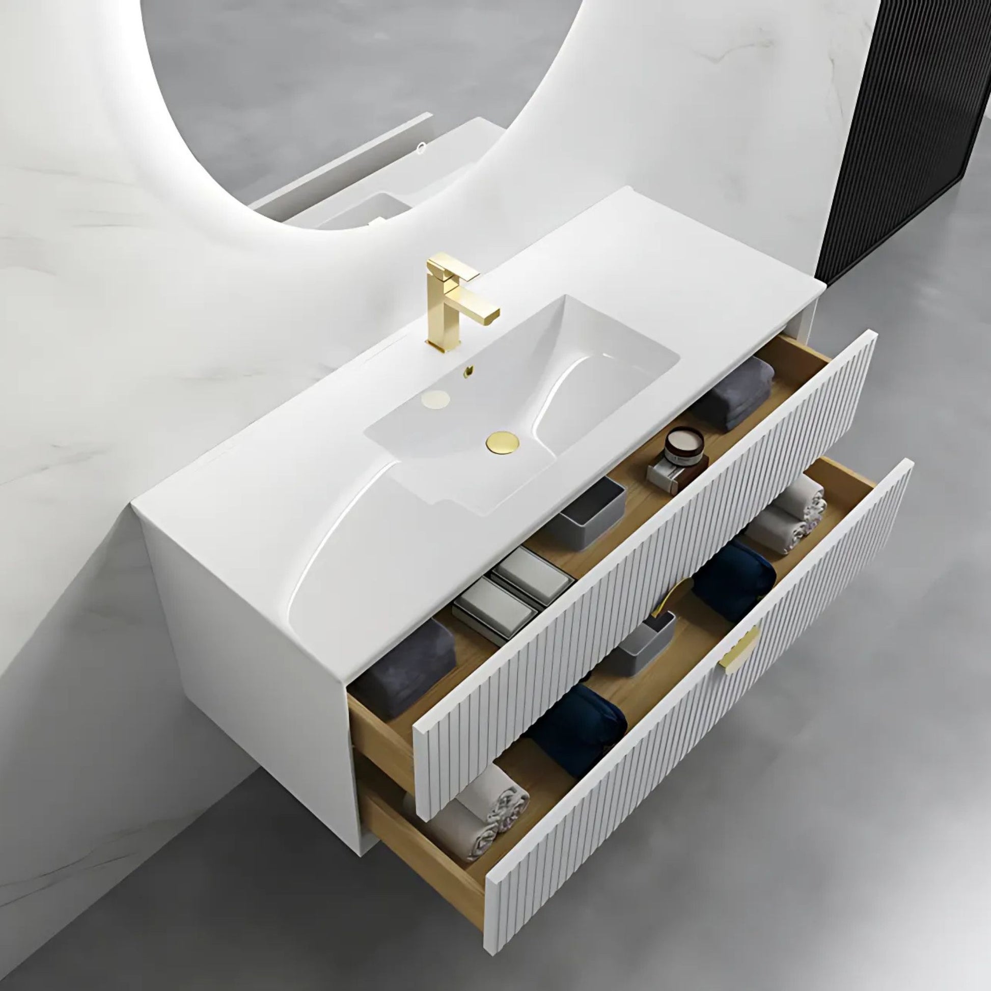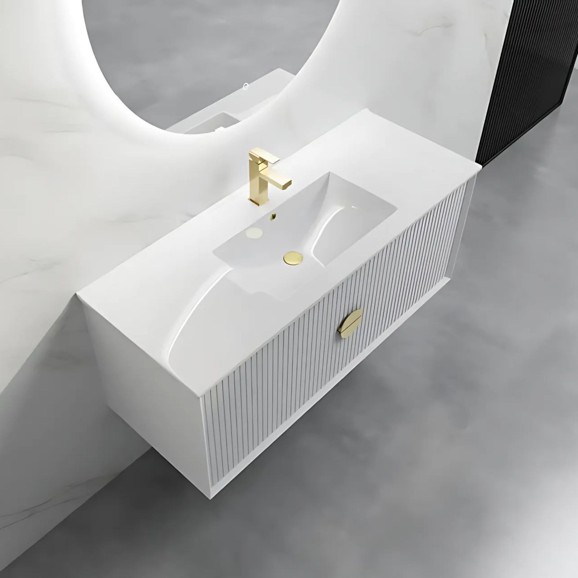 Transform your bathroom with this stunning contemporary floating vanity featuring distinctive vertical fluted detailing and warm brass accents. The floating design creates an airy, spacious feel while the textured white finish adds sophisticated depth.