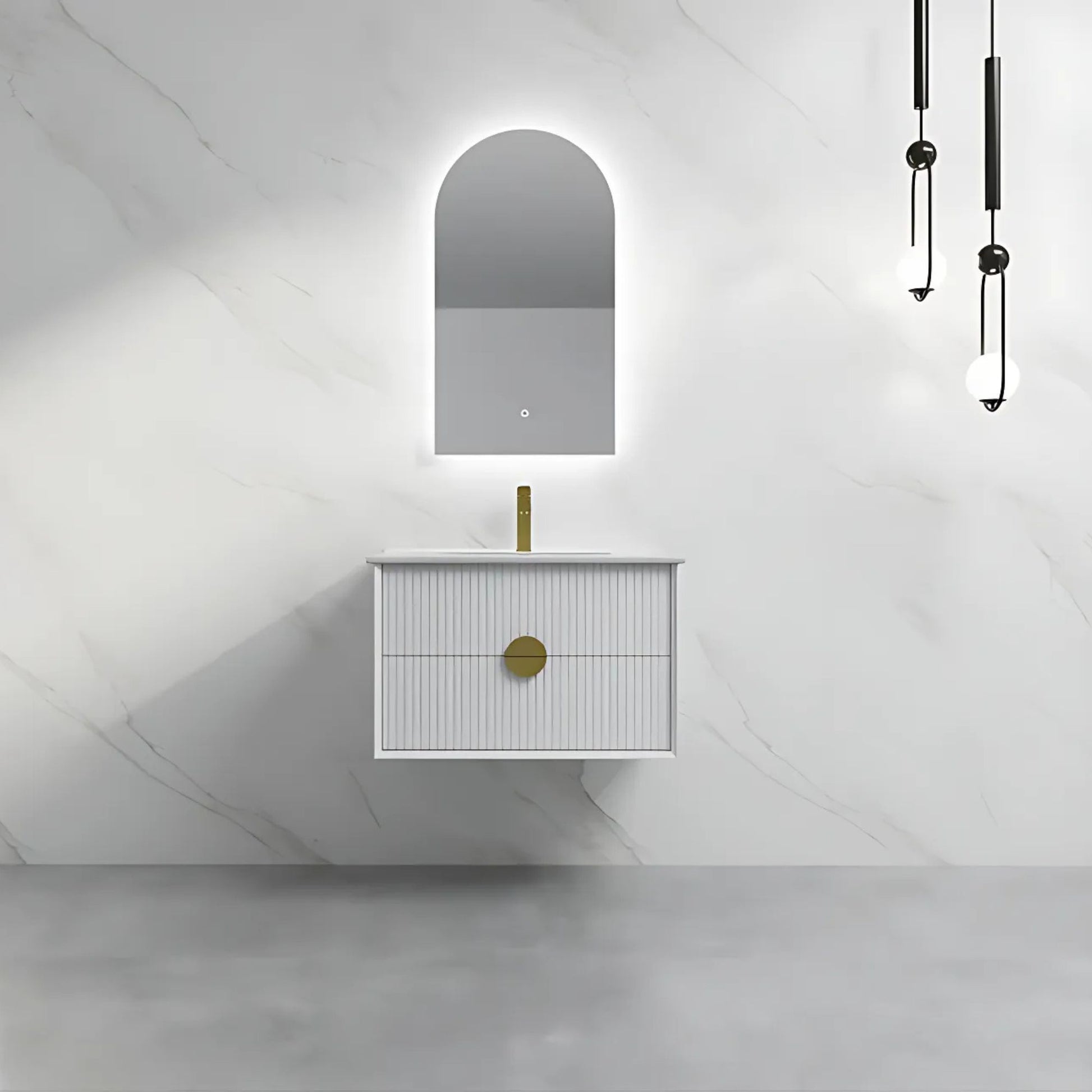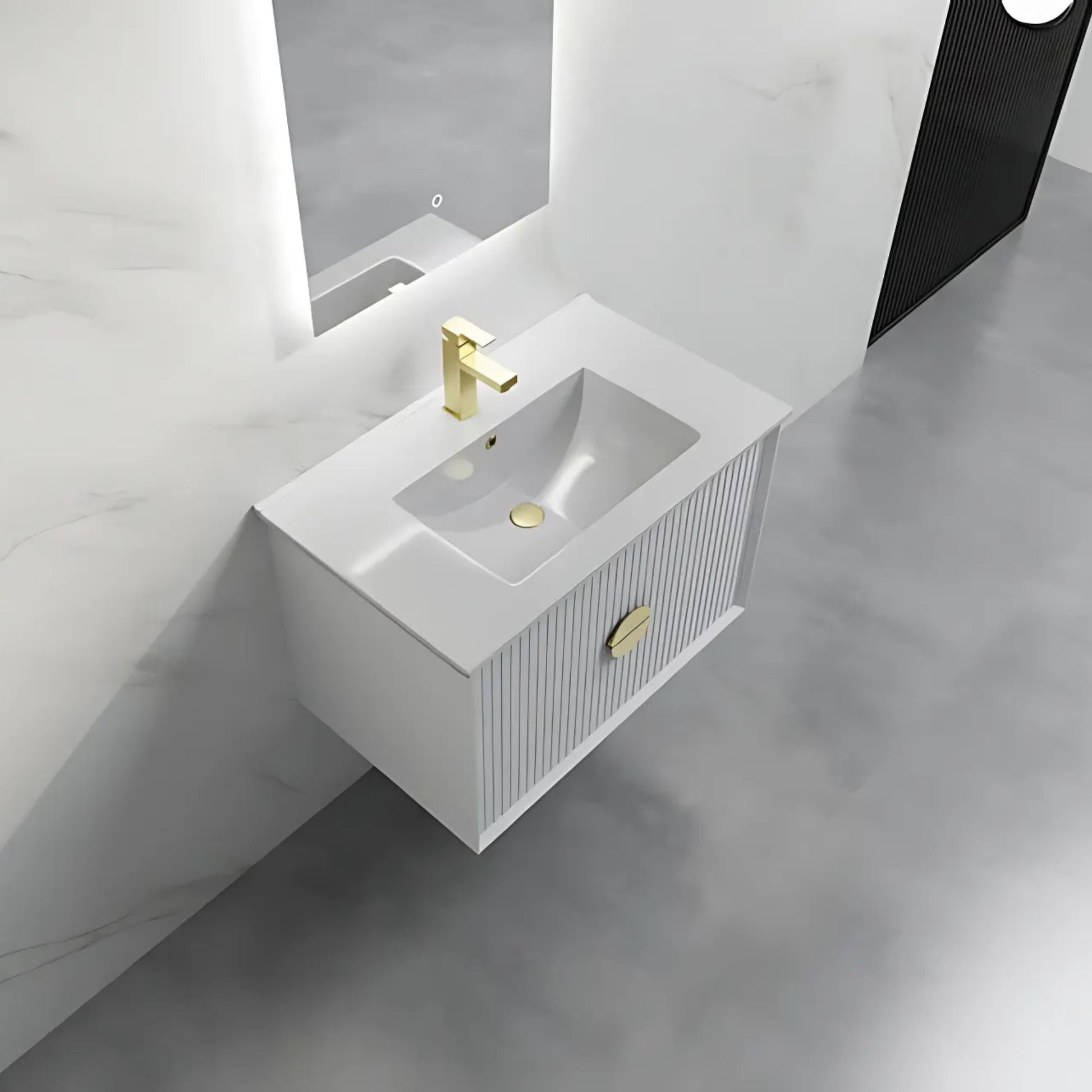 Transform your bathroom with this stunning contemporary floating vanity featuring distinctive vertical fluted detailing and warm brass accents. The floating design creates an airy, spacious feel while the textured white finish adds sophisticated depth.